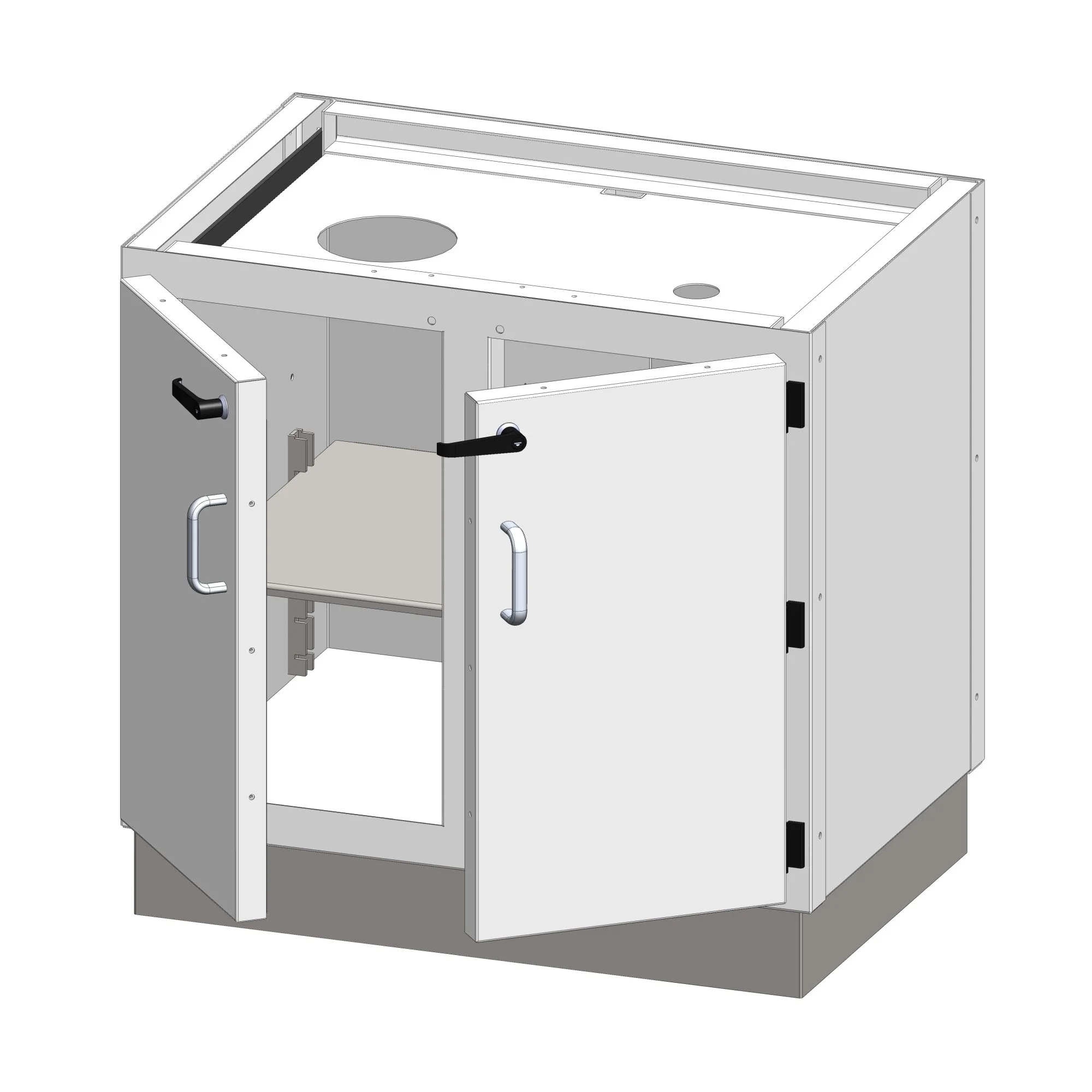 Available as a standard size with the details shown below or to a custom size and with custom worktop, the Dispensing Bench cabinet can be installed with up to 30mm of lead. The bench is split into two sides with individual doors. Each side features adjustable position shelves and a heavy duty mortice lock for securing the contents. Ideally suited to decay storage of excess doses and waste.